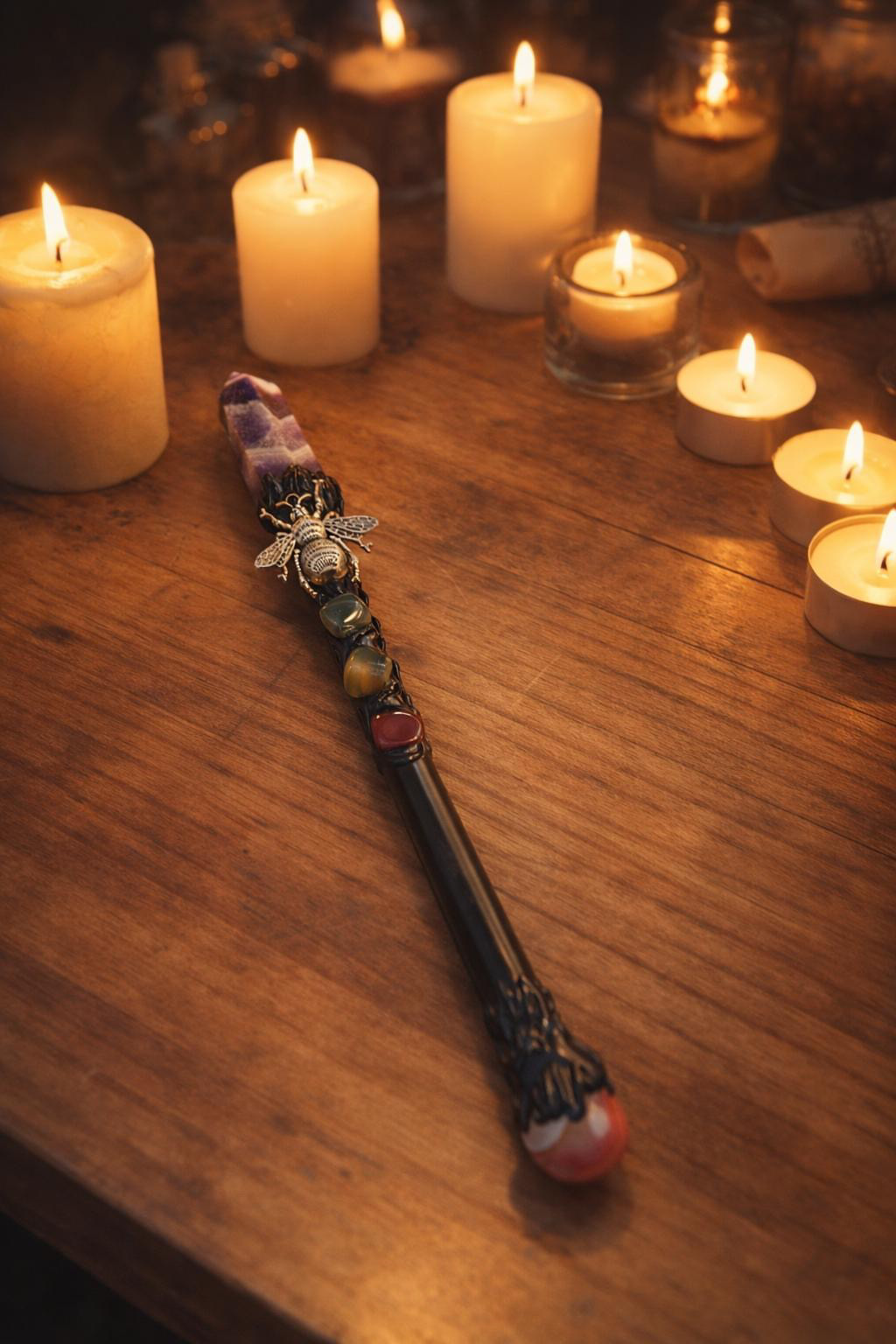 La pointe en améthyste aide à apaiser le mental et à développer l’intuition. Le jaspe apporte de l’ancrage et de la stabilité, tandis que l’agate favorise l’équilibre et l’harmonisation des énergies.