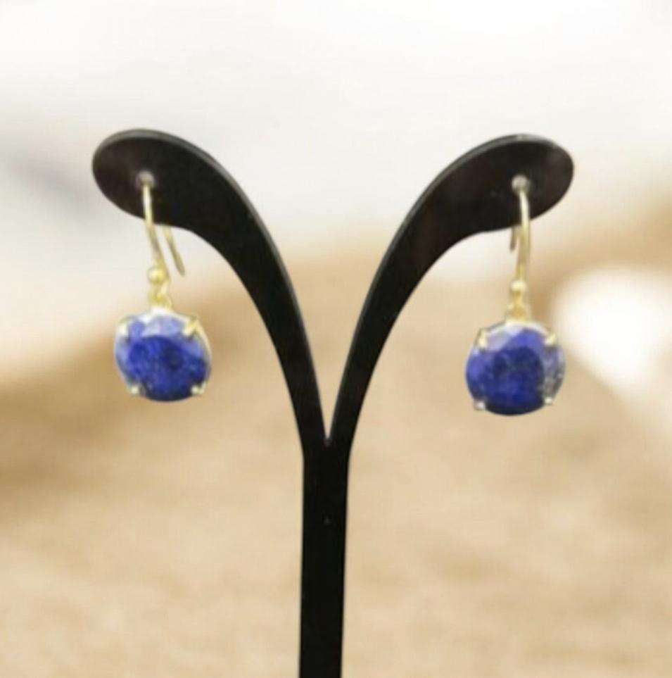 Boucles d’Oreilles en Lapis Lazuli et plaqué or. Le Lapis Lazuli calme tous types de névralgies et les brûlures. Il stimule les défenses immunitaires, la pousse des cheveux/ongles. Développe la clairvoyance et améliore la créativité. Pierre de guérison.