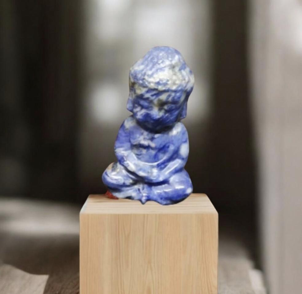 Bouddha en Sodalite. la Sodalite aide à clarifier l’esprit et la pensée logique. Elle apporte un sentiment de sécurité en cas de stress et contribue à apaiser la nervosité. Cette pierre est excellente pour les personnes hyperactives et celles souffrant du syndrome de l’échec.