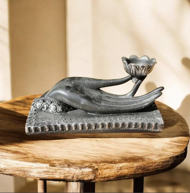 Bougeoir en forme de main tenant une lumière de cire. Il est en Polyrésine noir et argent . Ce mudra apporte la paix mentale, la confiance en soi et la pureté.