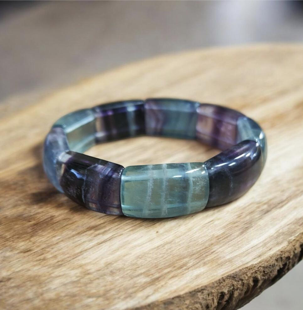 Ce bracelet en Fluorine naturelle (2x1cm)monté sur élastique est reconnu en lithothérapie pour apporter clarté mentale, apaisement et protection énergétique. Pierre de concentration, elle favorise la mémoire, aide à structurer les pensées et peut contribuer à diminuer la sensation des acouphènes en harmonisant le mental.