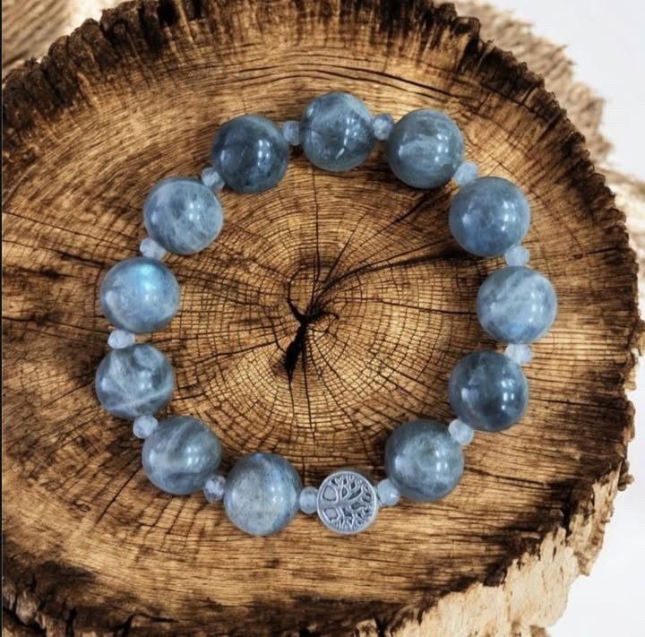Bracelet en Labradorite de Madagascar réalisé avec des perles en pierres naturelles de grande qualité d’un diamètre de 12 mm et des perles facettées de 4 mm, enfilées sur un fil élastique. En lithothérapie, la Labradorite est une pierre qui protège les personnes empathiques des problèmes des autres. Elle développe les dons et stimule les facultés d’auto-guérison. Elle favorise les amitiés. Idéale pour les thérapeutes. Pierre de protection.