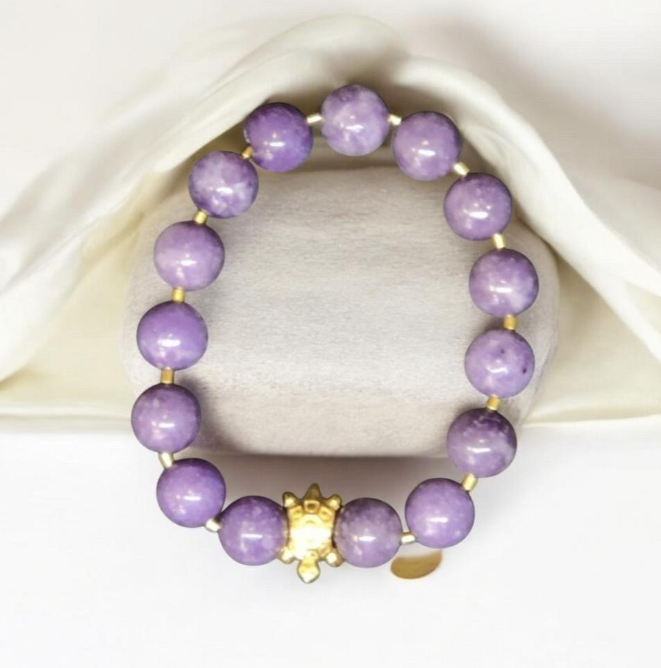 Bracelet en Lépidolite réalisé avec des perles en pierres naturelles de grande qualité d’un diamètre de 10 mm, enfilées sur un fil élastique avec de l’hématite dorée qui est une pierre d’ancrage et une tortue. La Lépidolite est une pierre qui aide à se concentrer et focaliser ses attentions . Elle soulage du trouble compulsif, des craintes des grands espaces et des lieux publics . Elle permet de lutter contre les dépendances, les obsessions et permet d’avoir un sommeil plus serein. Elle apaise les troubles bipolaires en agissant sur les sauts d’humeur.