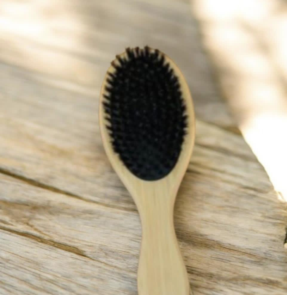 Brosse en bambou et poils de sanglier.. Les poils de sanglier sont riches en Kératine, améliorant ainsi la résistance des cheveux. Ils permettent un démêlage en douceur tout en nourrissant le cheveu grâce à une meilleure répartition du sébum.