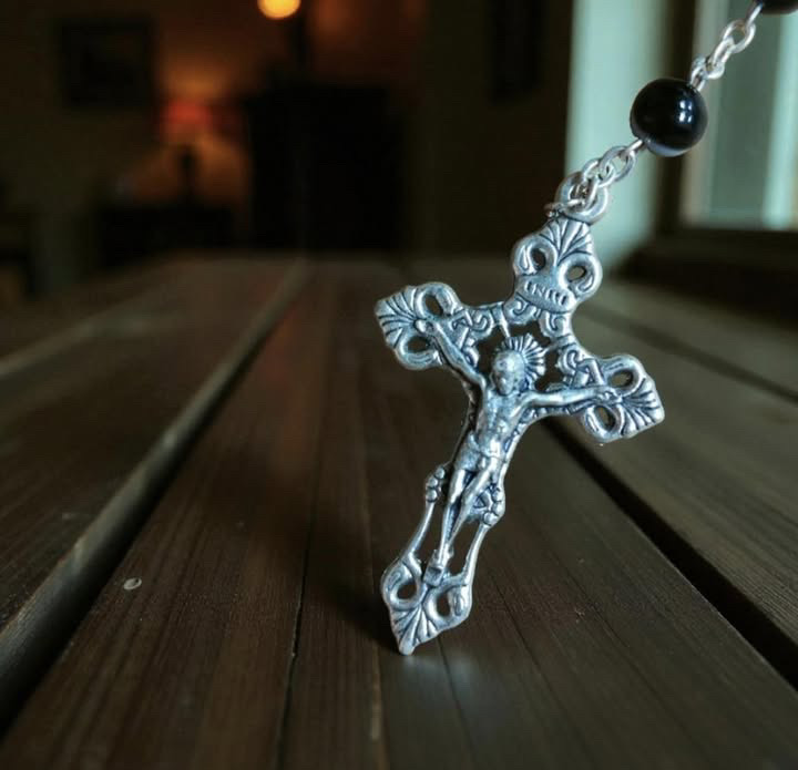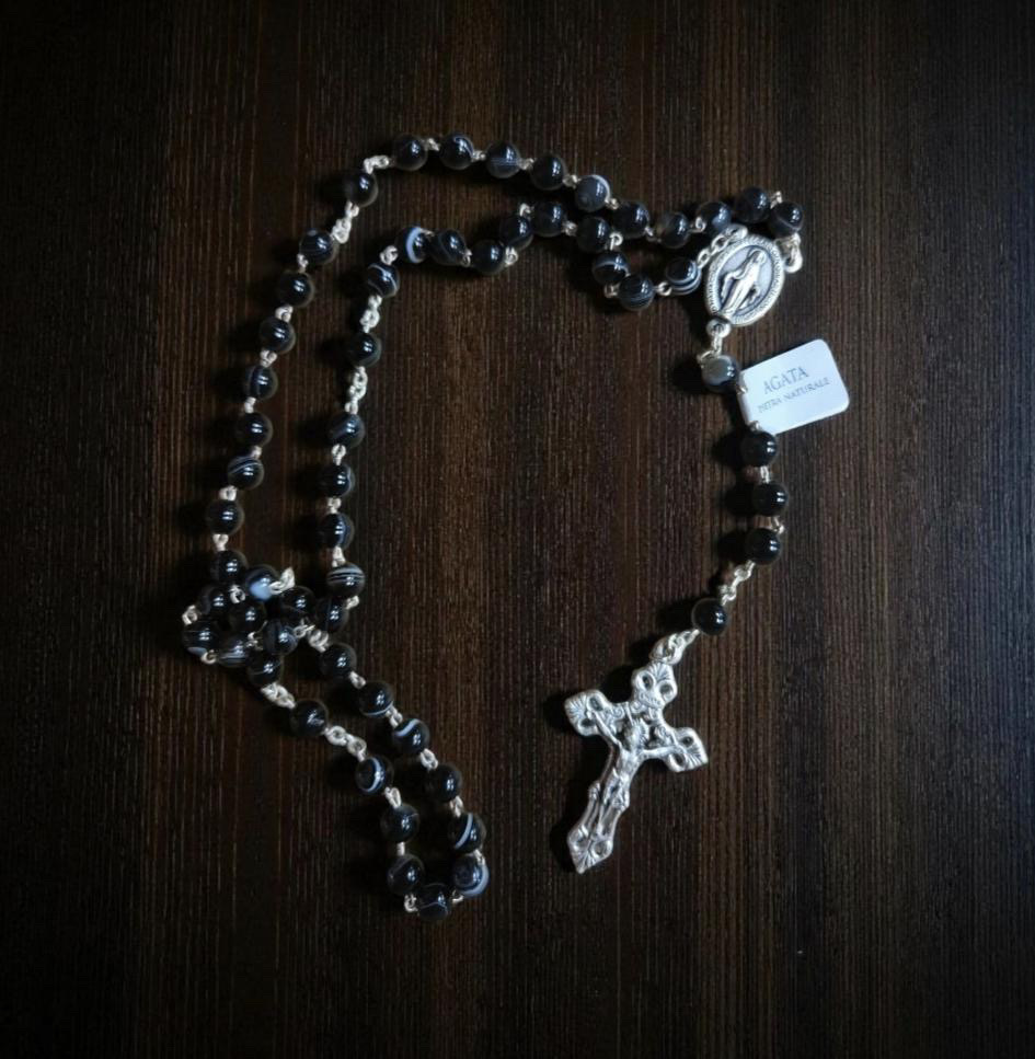 Ce chapelet est composé de grains en pierre naturelle d’agate noire de 7 mm, reliés par une chaîne argentée raffinée. La croix finement ornée apporte une touche de lumière et d’élégance, renforçant la profondeur de ce bel objet spirituel.