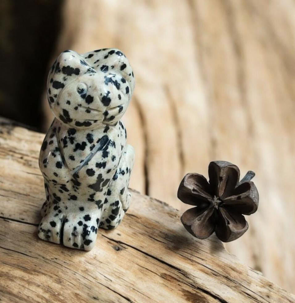 Chat 50 mm en Jaspe Dalmatien. En lithothérapie, le Jaspe Dalmatien favorise la circulation sanguine, facilite l’acceptation des changements de vie, et décuple l’endurance, notamment pour les sportifs. C’est une pierre de régulation.