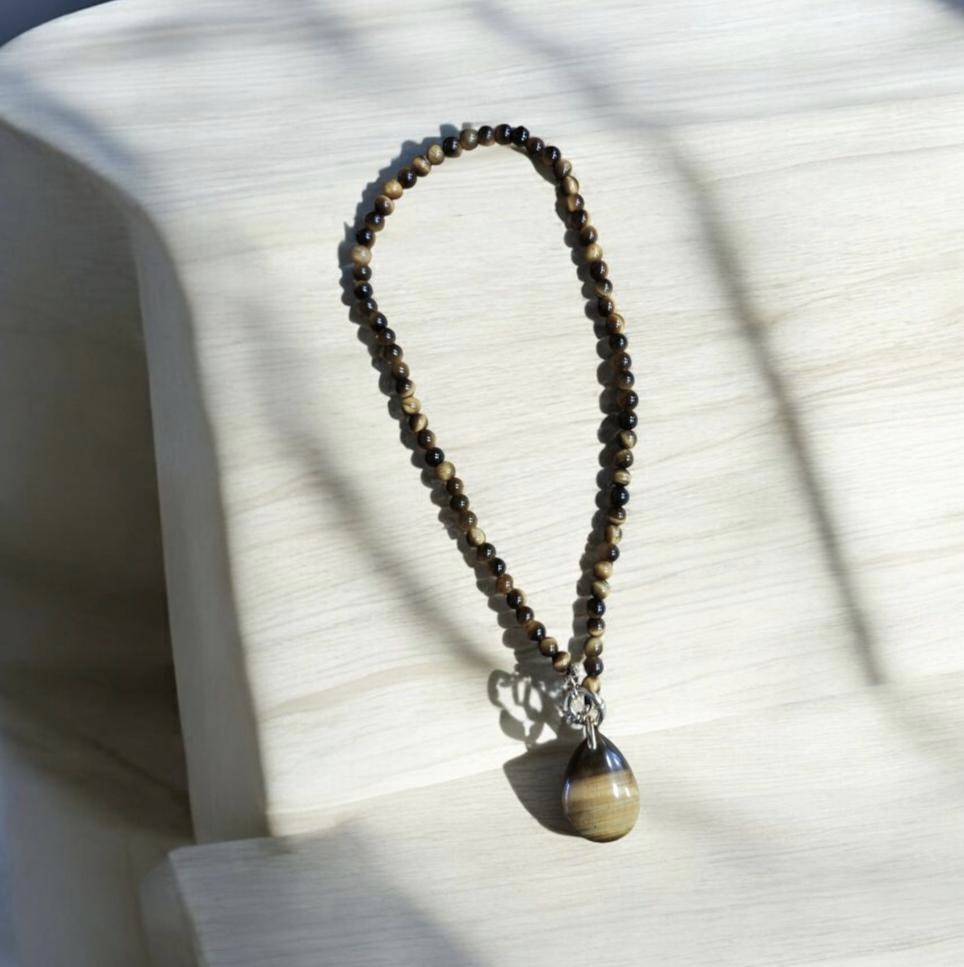 Collier Oeil de Tigre en Pierres naturelles de 6 mm avec pendentif en goutte de 3 cm et attache boué. L’Oeil de Tigre fortifie les os, les articulations et l’état général. Il aide à se fixer un objectif et à être persévérant. Cette pierre serait idéale pour se protéger des personnes jalouses ou envieuses, ainsi que contre le mauvais œil, en formant un bouclier de protection qui repousse les énergies négatives.