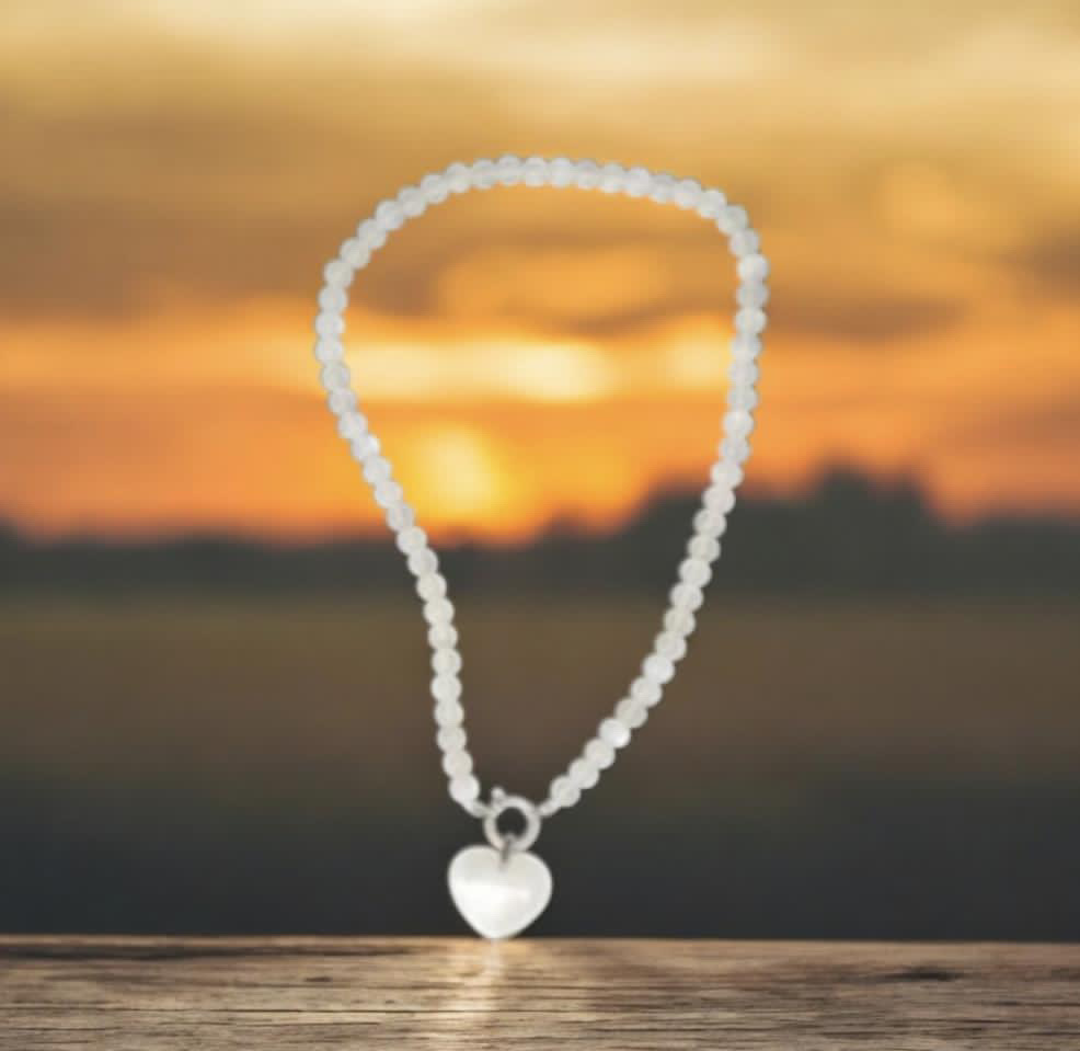 Collier cœur en pierre de lune naturelle de grande qualité. La Pierre de Lune aide à lutter contre la stérilité et le déséquilibre hormonal, adouci le caractère en couple et rend plus compréhensif. Elle développe l’activité spirituelle, l’intuition et l’imagination. Pierre de la féminité.