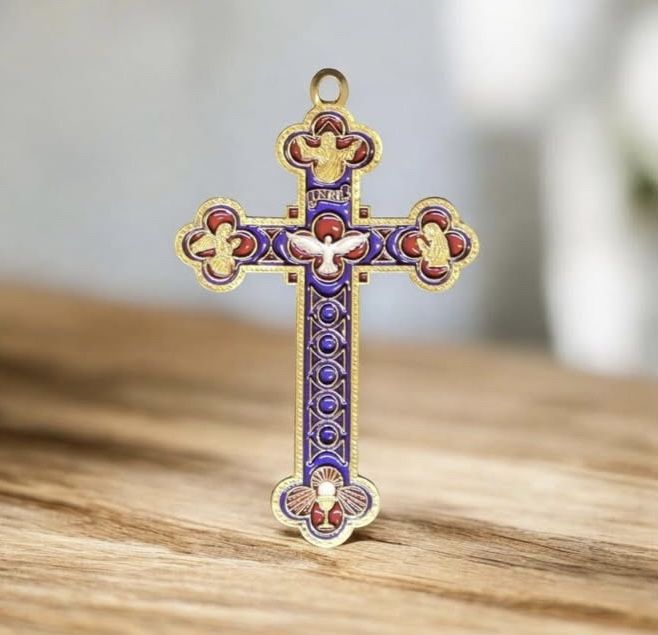 Croix baroque délicatement émaillée en bleu et rouge. Cette croix évoque la victoire de la lumière divine sur les ténèbres.