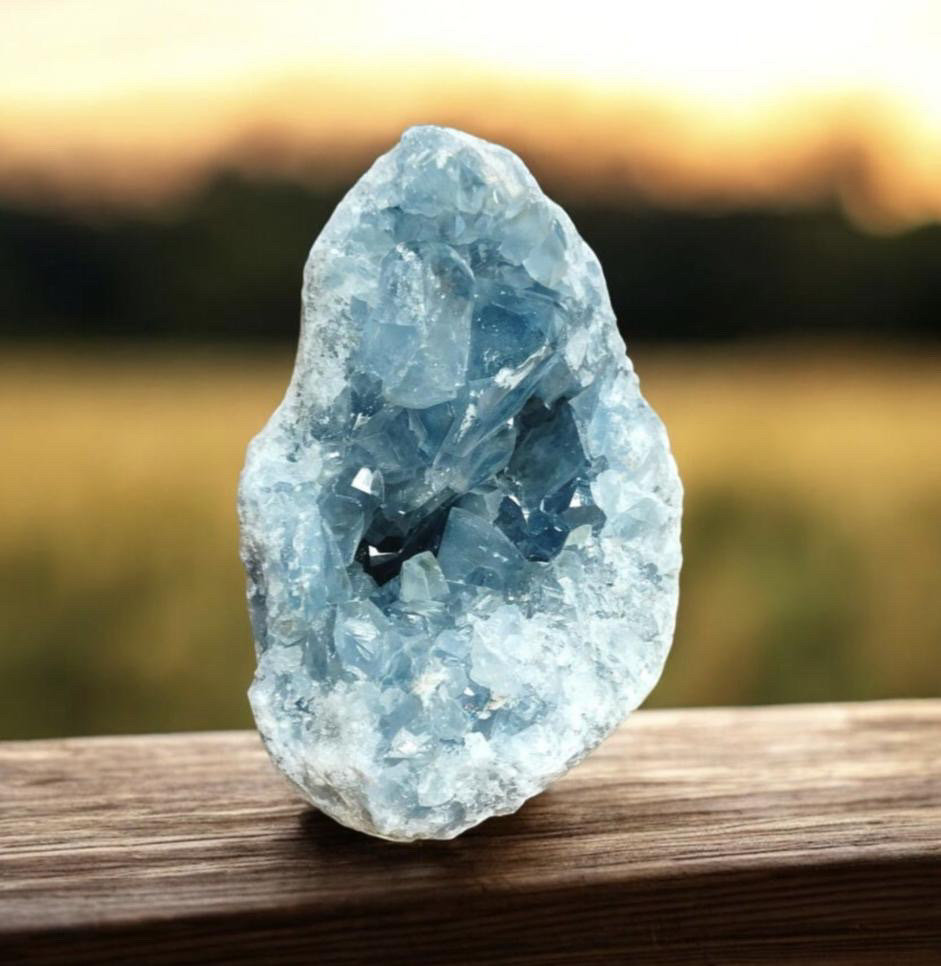 Géode en Célestine. La Célestine amène à se libérer de ses oppressions ou de ses contraintes. Elle apaise des angoisses et aide à surmonter le sentiment d’inutilité. Elle facilite la reliance avec le plan céleste et divin.