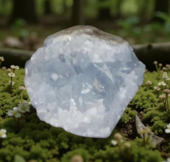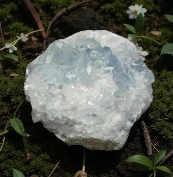 Géode en Célestine. La Célestine amène à se libérer de ses oppressions ou de ses contraintes. Elle apaise des angoisses et aide à surmonter le sentiment d’inutilité. Elle facilite la reliance avec le plan céleste et divin.
