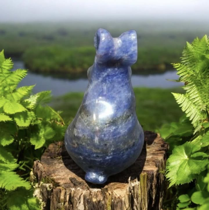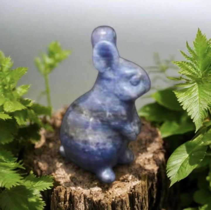 Lapin en Sodalite. la Sodalite aide à clarifier l’esprit et la pensée logique. Elle apporte un sentiment de sécurité en cas de stress et contribue à apaiser la nervosité. Cette pierre est excellente pour les personnes hyperactives et celles souffrant du syndrome de l’échec.