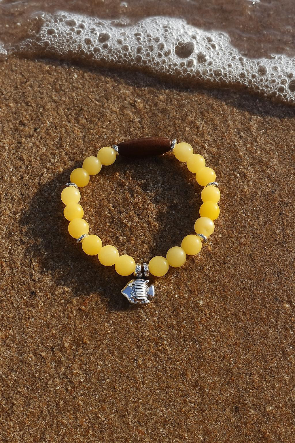 La calcite jaune pour la chaleur, la joie et la clarté intérieure, une perle en bois pour l’ancrage et la connexion à la nature et un poisson argenté en acier inoxydable, symbole de fluidité, d’adaptabilité et de liberté.