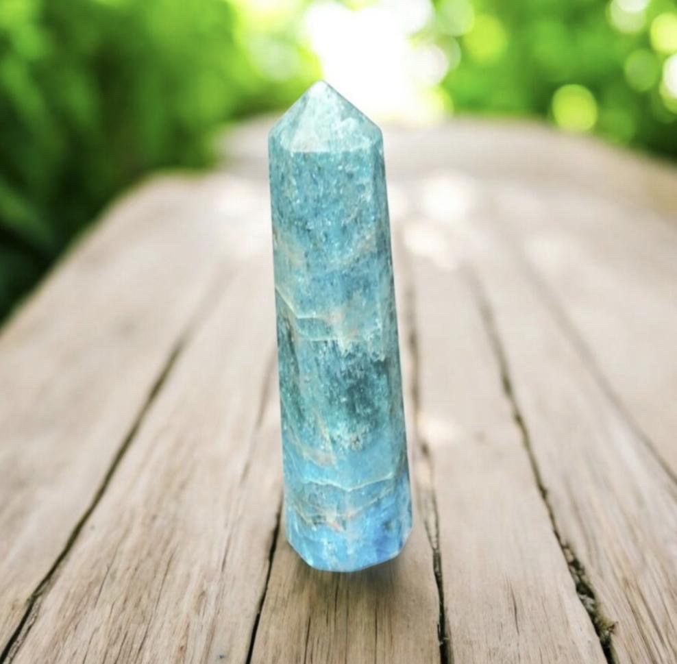 Obélisque en pierre naturelle Apatite Bleue. Cette pierre dissout la pression engendrée par celles trop longtemps refoulées, contenues et renfermées. Elle a le pouvoir de relancer le système émotionnel lorsque celui-ci a été trop longtemps inhibé. cette pierre est très connue pour ses capacités amincissantes. En fait, son action réduit l’appétit et favorise le système digestif. Elle va également agir sur le sommeil, la croissance cellulaire et la sexualité.