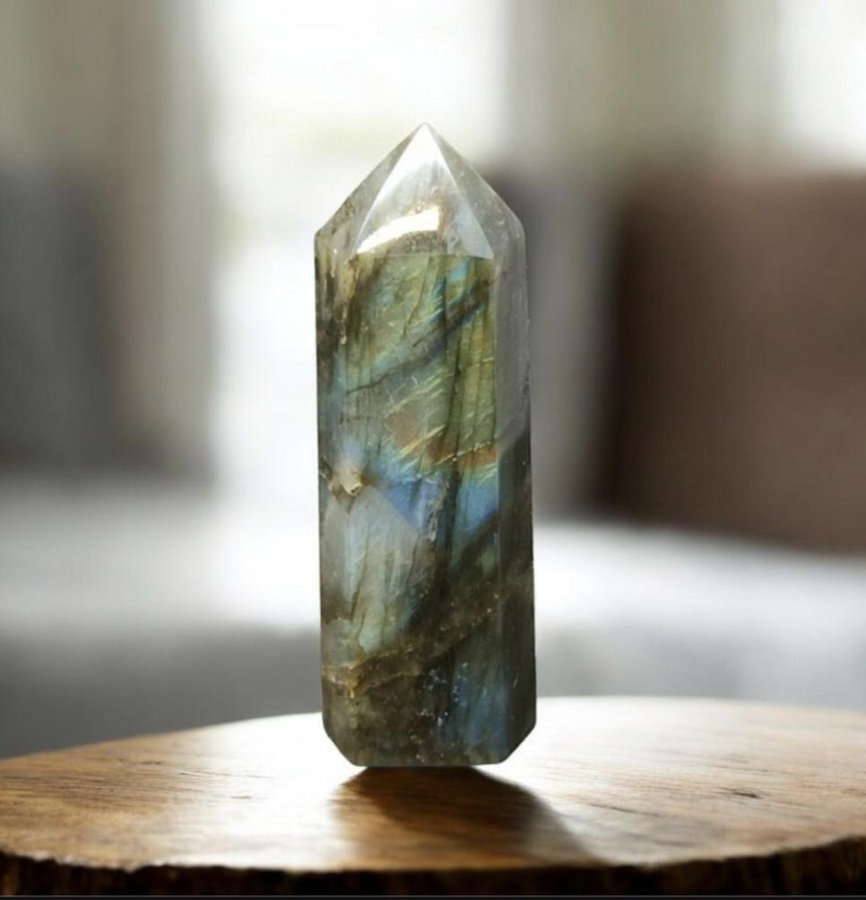 Obélisque en Labradorite de Madagascar. La Labradorite est une pierre qui protège les personnes empathiques des problèmes des autres. Elle développe les dons et stimule les facultés d’auto-guérison. Elle favorise les amitiés. Idéale pour les thérapeutes. Pierre de protection.