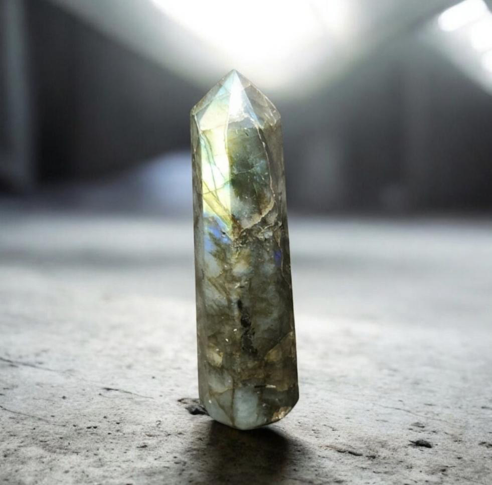 Obélisque en Labradorite de Madagascar. La Labradorite est une pierre qui protège les personnes empathiques des problèmes des autres. Elle développe les dons et stimule les facultés d’auto-guérison. Elle favorise les amitiés. Idéale pour les thérapeutes. Pierre de protection.