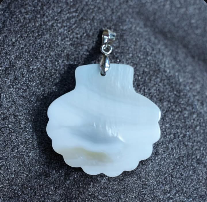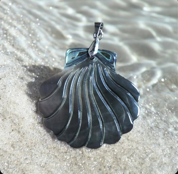 Ce pendentif en forme de coquillage, orné de nacre noire, est une pièce choisie et assemblée dans le respect du rythme naturel, en lien avec l’énergie de la mer.