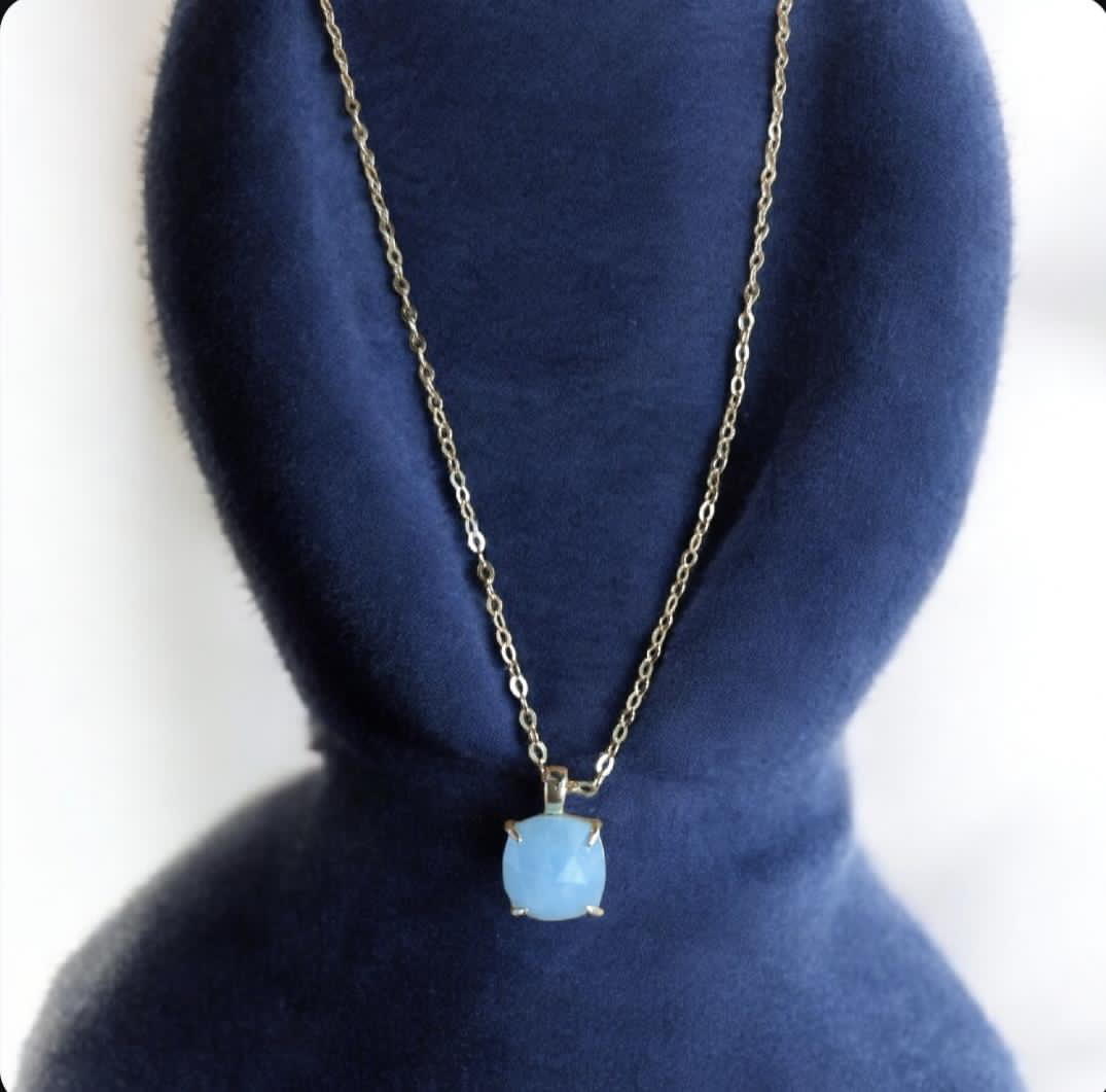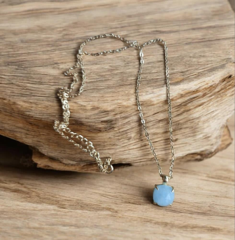 Pendentif avec chaîne en argent doré, avec une pierre naturelle en Aigue-Marine de haute qualité. L’Aigue-Marine à le pouvoir d’accentuer la sensibilité et l’expressivité de ceux qui la portent. Elle apporte la paix, apaisement et sérénité, renforçant l’amour au sein d’une relation déjà établie.