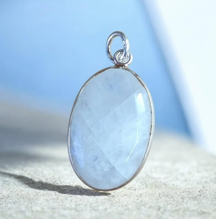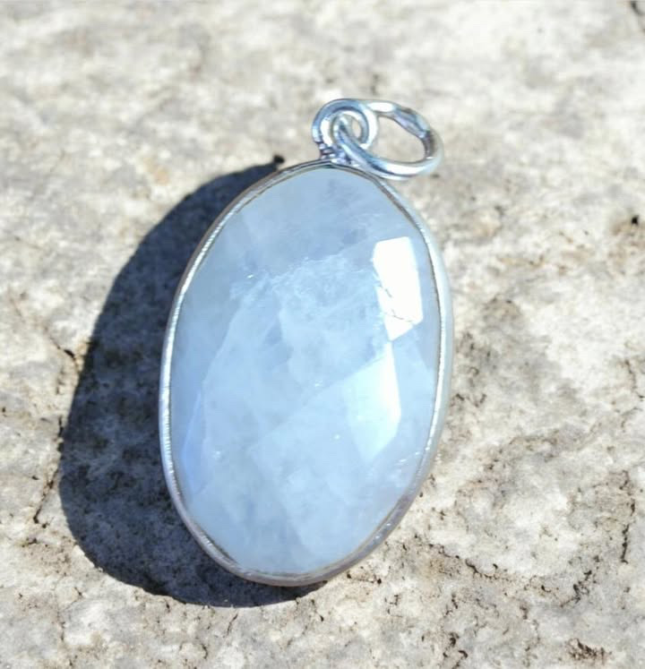 Pendentif en Pierre de Lune facetté et Argent. La pierre de lune aide à lutter contre la stérilité et les déséquilibres hormonaux. Elle adoucit le caractère en couple, favorisant la compréhension mutuelle, tout en développant l’activité spirituelle, l’intuition et l’imagination. Pierre de la féminité.