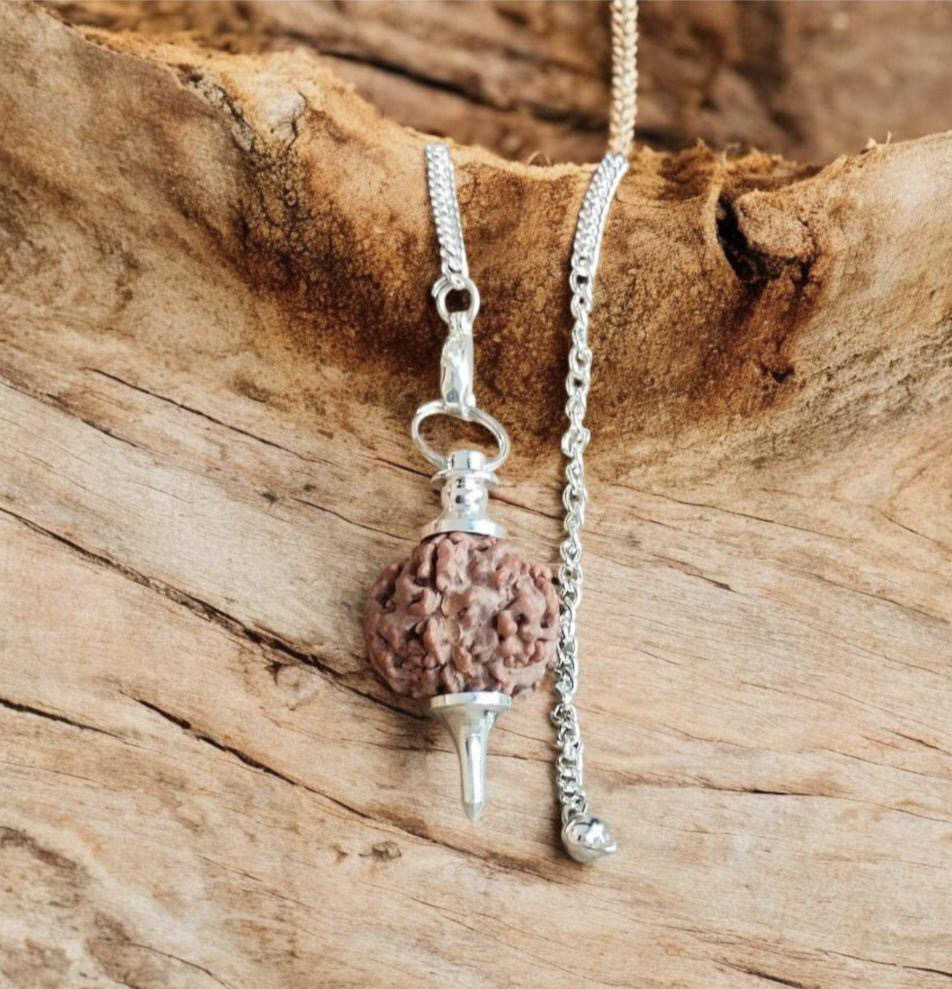 Pendule couleur argent avec une graine sacrée de Rudraksha indienne. Cette graine émet de puissantes vibrations énergétiques et électromagnétiques. Elle favorise l’élévation spirituelle, la chance et la méditation. Cette graine apaise l’esprit et développe l’intuition.