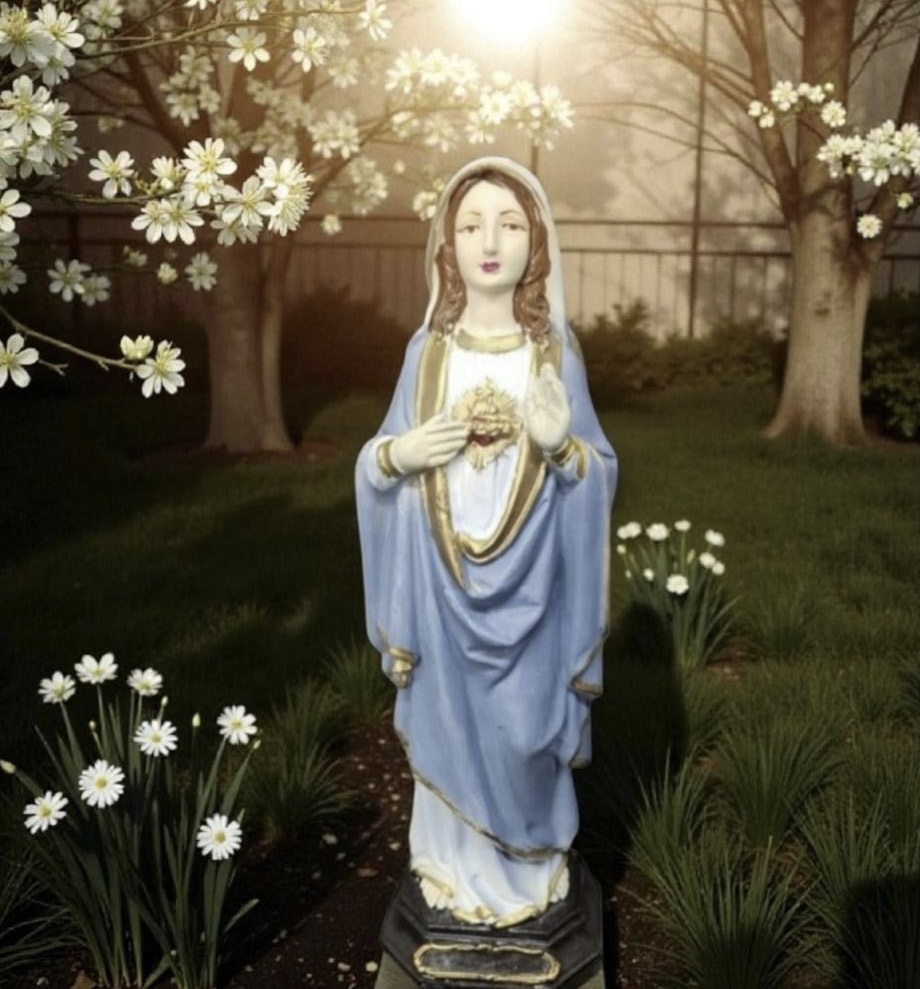 Statue de la Sainte mère Marie Sacré-Coeur peinte à la main. Le Cœur Immaculé de Marie est une dévotion catholique qui fait référence à la vision de la vie intérieure de Marie, ses joies et ses peines, ses vertus et ses perfections cachées, et, surtout, son amour virginal pour Dieu le Père, son amour maternel pour son fils Jésus-Christ.