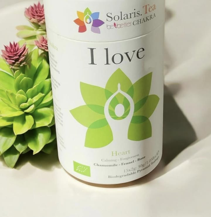 The bio Solaris chakra du cœur. Cette infusion à base de camomille, de citronnelle, de fenouil et de rose est apaisante, réconfortante et favorise une douce sensation de bien-être. Le chakra du cœur est le centre de votre sens de la compassion et de votre attention envers les autres, vous encourageant à aimer et à pardonner véritablement. Contenant 15 sachets de thé en forme de pyramide. Préparation : Eau à 100 degrés, infuser pendant 3 minutes, peut être infusé jusqu’à 2 fois